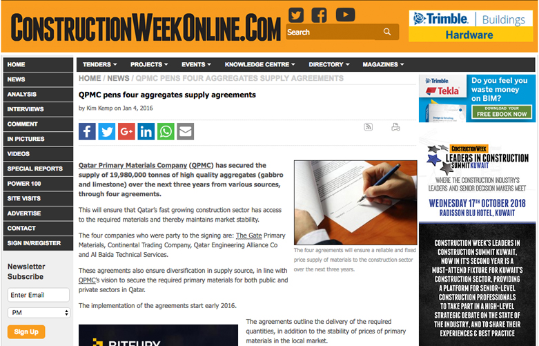 The four agreements were signed with the following companies: The Gate Primary Materials, Continental Trading Company, Qatar Engineering Alliance Co and Al Baida Technical Services, QPMC said in a release on Sunday.