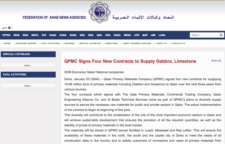 Doha, January 03 (QNA) – Qatar Primary Materials Company (QPMC) signed four new contracts for supplying 19.98 million tons of primary materials including (Gabbro and limestone) to Qatar over the next three years from various sources. The four contracts which signed with The Gate Primary Materials, Continental Trading Company, Qatar Engineering Alliance Co. and Al Baida Technical Services come as part of QPMC’s plans to diversify supply sources to secure the necessary raw materials for public and private sectors in Qatar. The actual implementation of the contract to begin at beginning of this year.