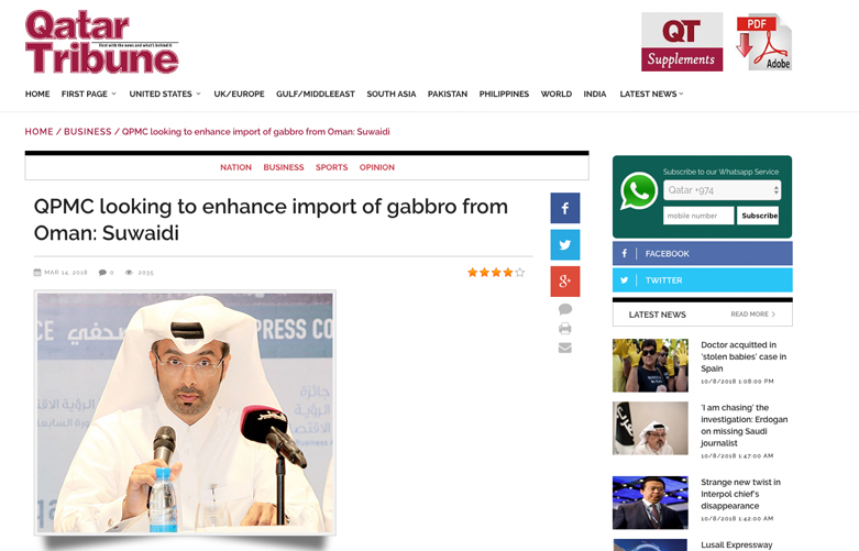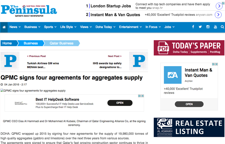 DOHA: QPMC wrapped up 2015 by signing four new agreements for the supply of 19,980,000 tonnes of high quality aggregates (gabbro and limestone) over the next three years from various sources. The agreements were signed to ensure that Qatar’s fast growing construction sector continues to thrive in the right direction by securing the required materials and thus maintaining market stability. The four agreements were signed with the companies ,The Gate Primary Materials, Continental Trading Company, Qatar Engineering Alliance Co and Al Baida Technical Services.