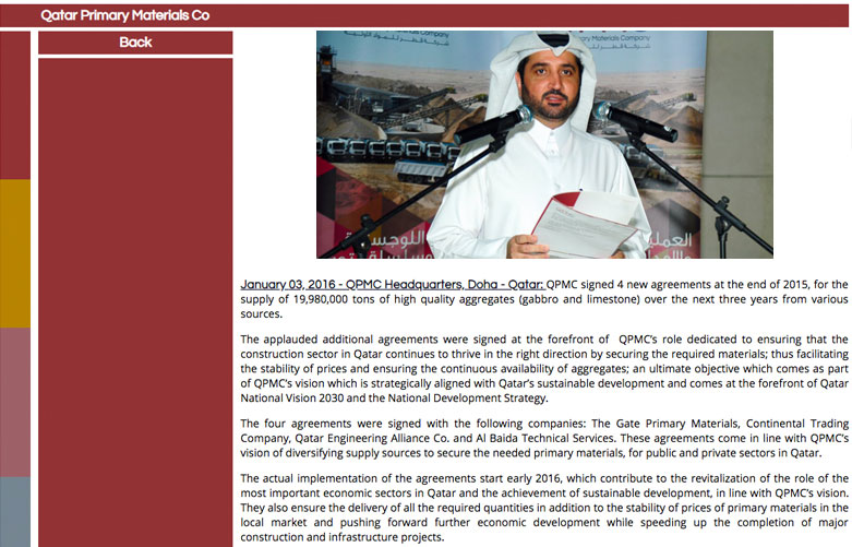 QPMC signed 4 new agreements at the end of 2015, for the supply of 19,980,000 tons of high quality aggregates (gabbro and limestone) over the next three years from various sources. The applauded additional agreements were signed at the forefront of QPMC’s role dedicated to ensuring that the construction sector in Qatar continues to thrive in the right direction by securing the required materials; thus facilitating the stability of prices and ensuring the continuous availability of aggregates; an ultimate objective which comes as part of QPMC’s vision which is strategically aligned with Qatar’s sustainable development and comes at the forefront of Qatar National Vision 2030 and the National Development Strategy.